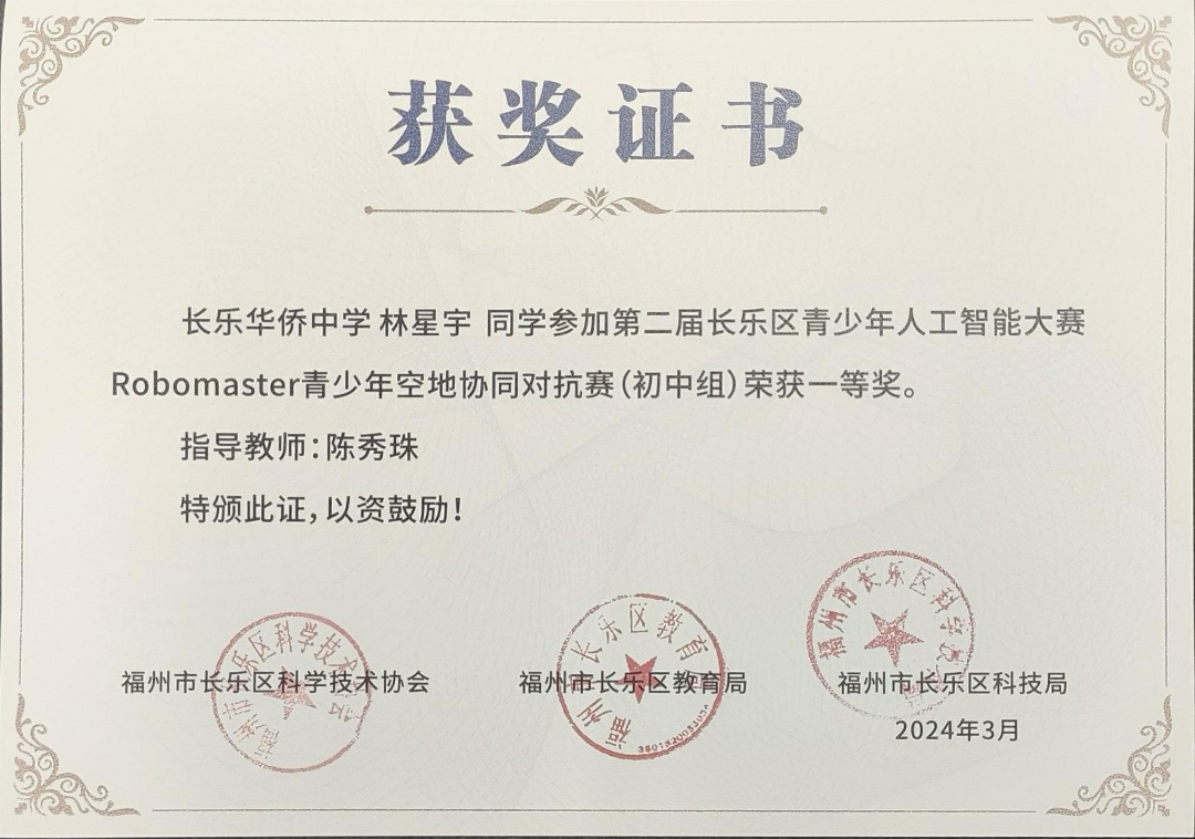 在2024年长乐区第二届青少年人工智能大赛中,我校战队表现出色,斩获初中组“智能机器人创意赛”、初中组“Robomaster青少年空地协同对抗赛”两项冠军。其中,在初中组“智能机器人创意赛”中李可言、陈嘉宏、王子俊获个人一等奖;在初中组“Robomaster青少年空地协同对抗赛”中倪宇涵、林逸铖、林星宇、魏文希、陈嘉宏获个人一等奖,李均赫、余弘煊、陈鸿毅、李美勋获个人二等奖,周智伦获个人三等奖。我校获赛事“优秀组织奖”。